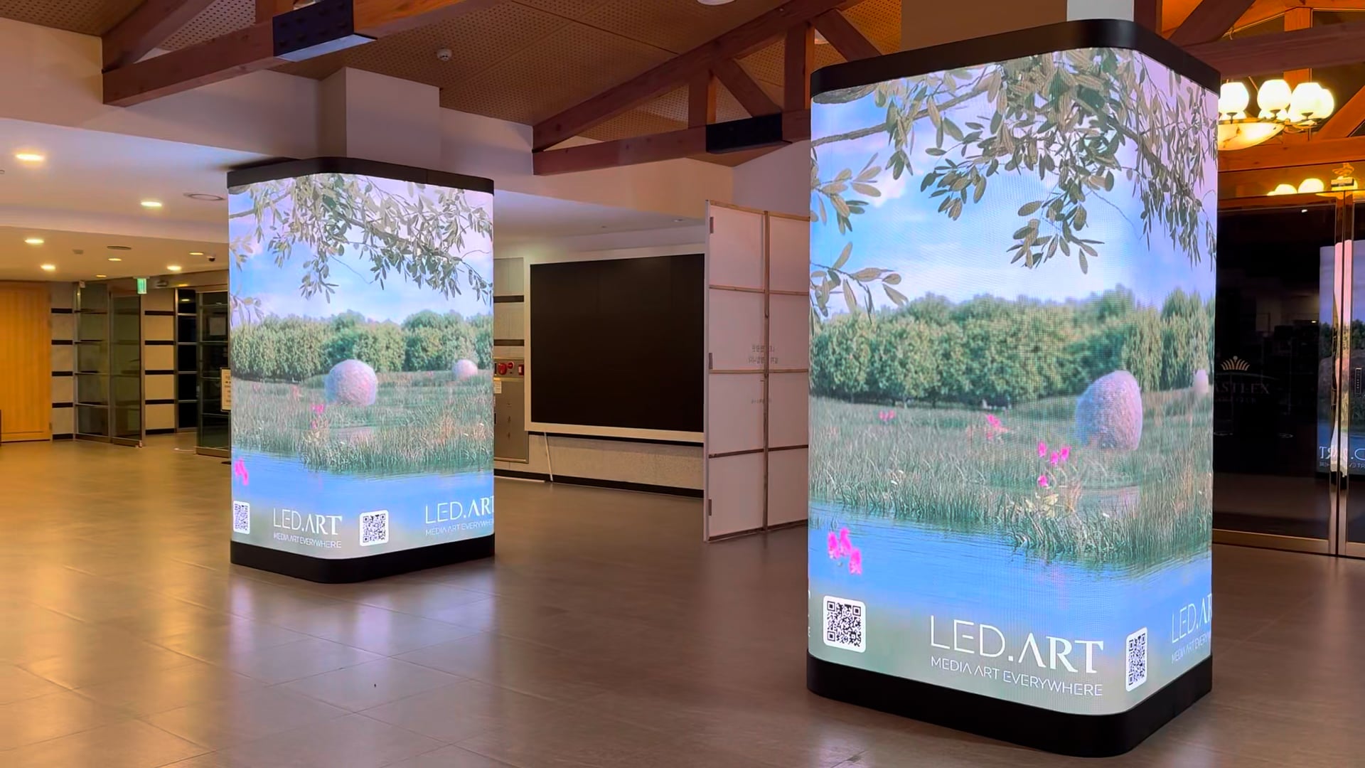 골프클럽하우스 내에 LED디스플레이를 납품 및 설치하였습니다. 고객사의 요청에 따라 90도로 꺾기는 면은 곡면으로 처리하여 부드러운 연출을 하였습니다. 기둥당 총 6개의 특수제작형 곡면 케비넷 타입을 활용하여 케비넷 및 모듈 단차를 최소화하였습니다. 정밀한 영상표현과 자연스러운 색감을 구현하기 위해 16bit 컬러 Gray Scale을 적용한 제품입니다.