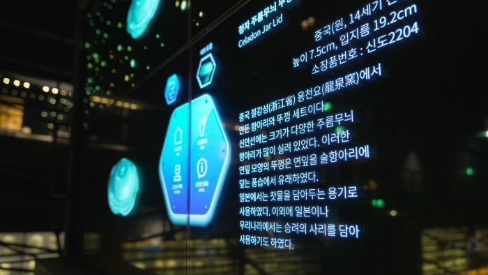 전라남도 신안 앞바다에 1323년 기상재해로 침몰된 신안선과 신안 선내 유물을 디지털 실감형 미디어 체험으로 복원하는 프로젝트입니다. 현재 남아있는 신안선 바닥 부분을 투영을 통해 복원되는 콘텐츠를 제작하여, 몰입형 미디어 체험공간을 통해서 홀로그램과 같이 표현할 수 있는 투명 OLED의 장점을 극대화하였습니다. 신안선에 유물은 투명 OLED를 통해 3D 이미지로 확인할 수 있으며, 900년 전 신안선을 IR 터치를 통해서 신안선 복원을 할 수 있으며, 신안선 공간과 유물을 확인할 수 있습니다. 또한, 당시 선상에서 놀이와 음식문화를 재연을 통해서 실제와 가상의 시각적 연결을 문화재 분야에서 역동적인 변화를 이끌어 낼 수 있습니다.
