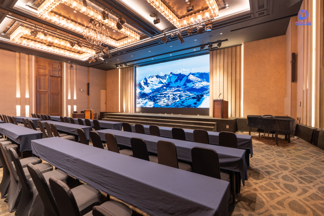 연회장 전면에는 대형 LED 디스플레이가 설치되어, 넓은 공간에서도 뛰어난 시인성과 몰입감을 제공합니다.
